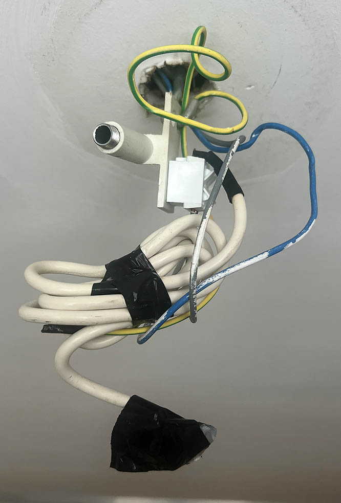 • Cómo se colgó. La placa del techo se instaló sobre una placa existente y parece que conectaron los cables a las antiguas.