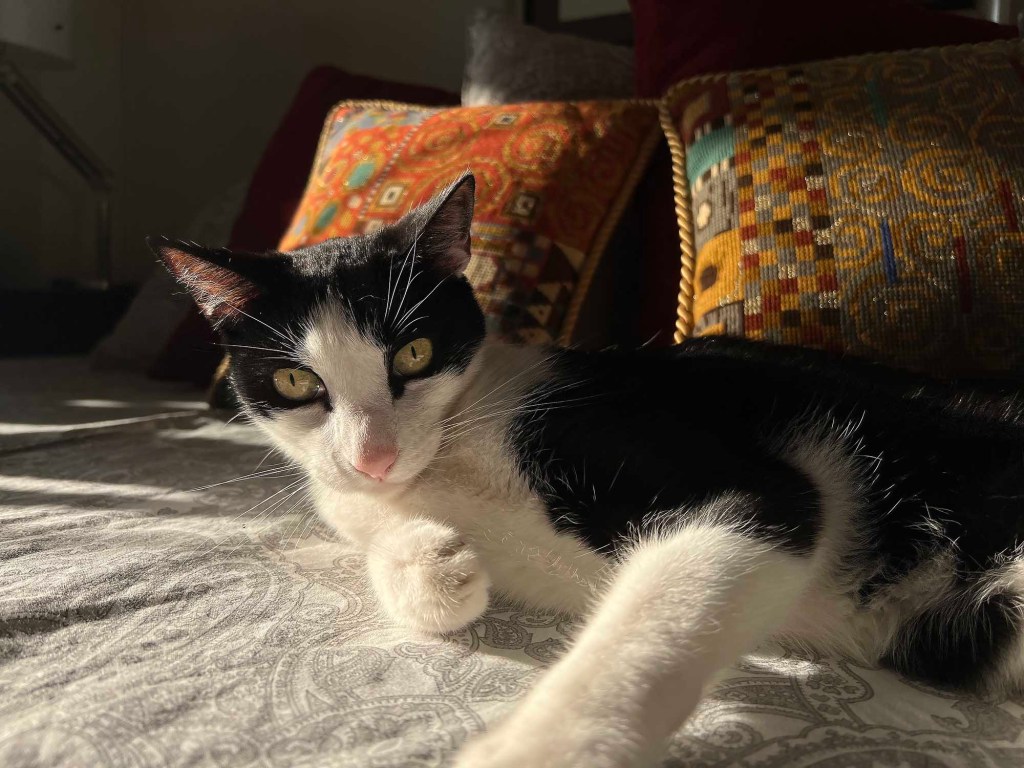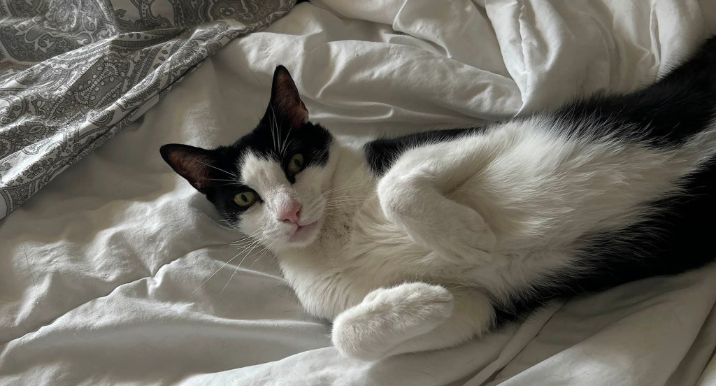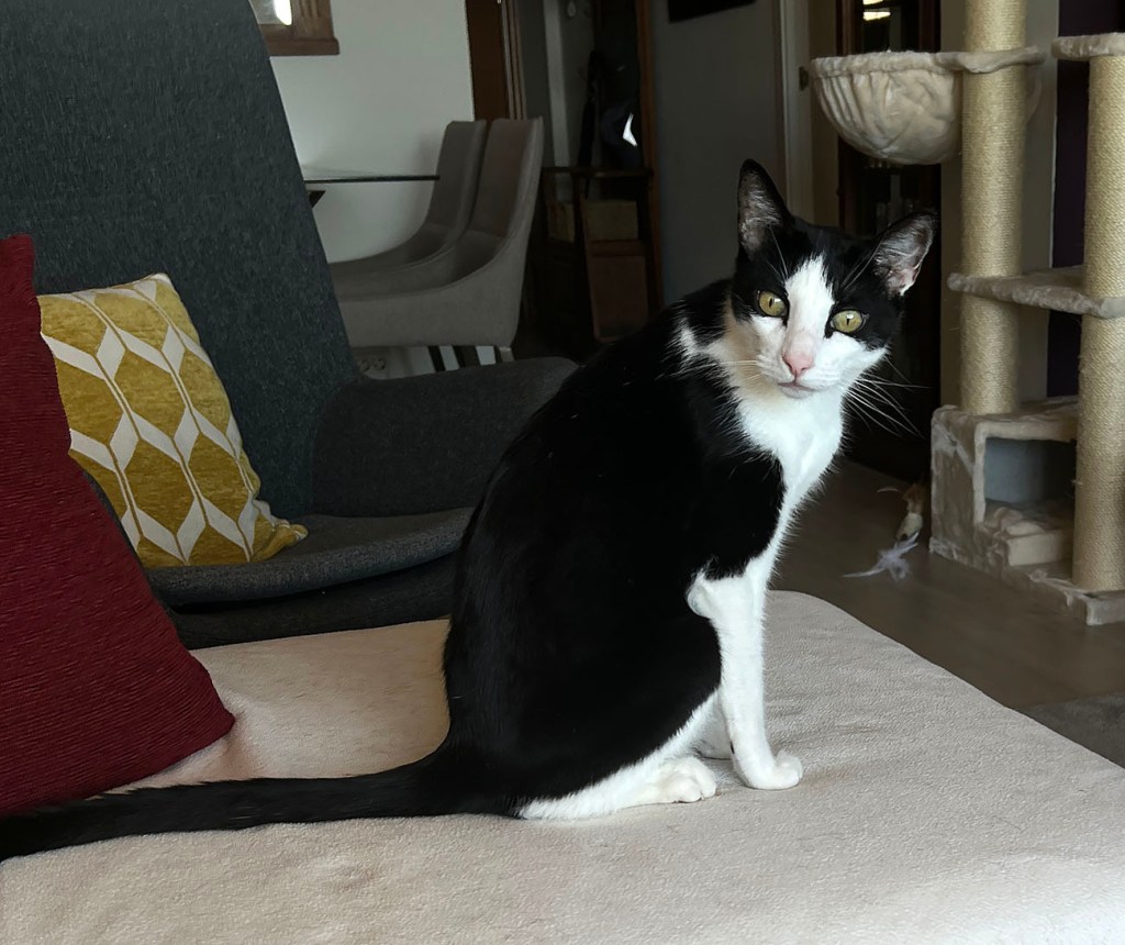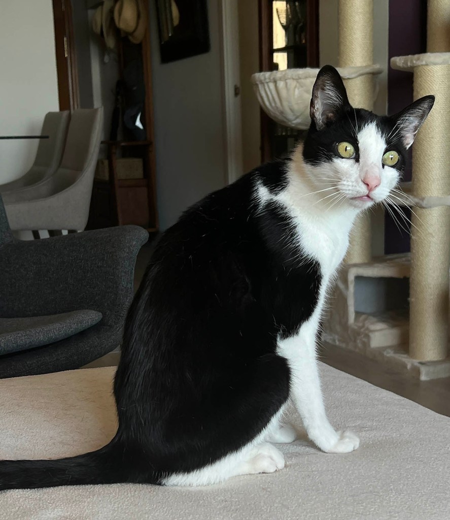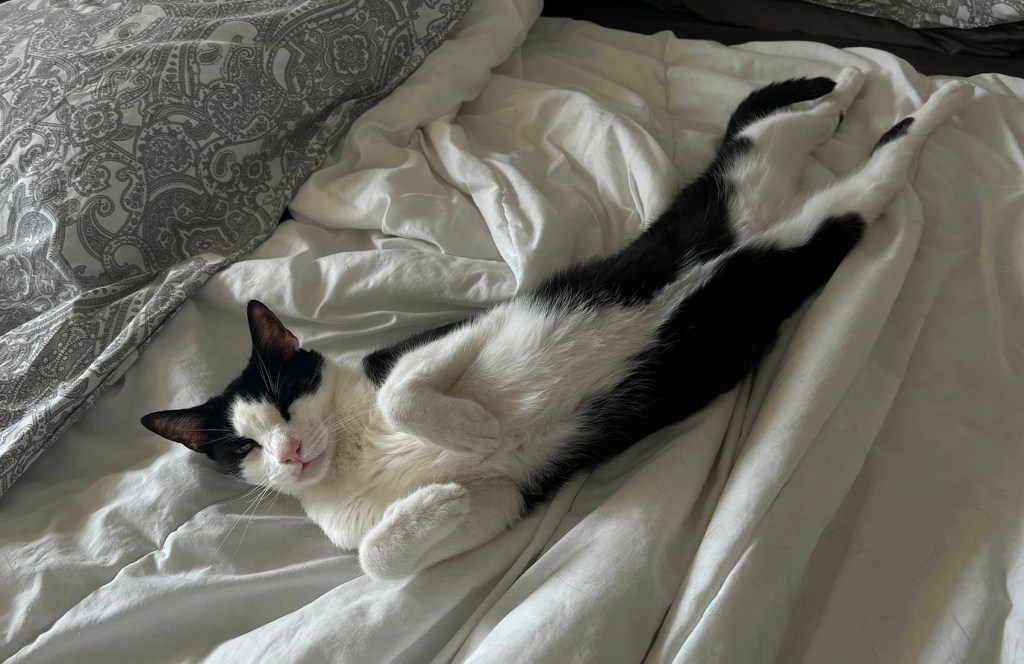 Oh, we’ve figured it out. SG will wander around because Moose or Dudo has decided to curl up in his (their) office chair. They really don’t like having to move for him. I am required to sleep on my left side with a pillow next to me, so Dudo can curl up and be petted. If he finds me on my right side, he gets really annoyed — and meows until I roll over (and place the pillow). Moose was snuggled up against SG’s legs in that photo. His idea of bliss (mine, too).