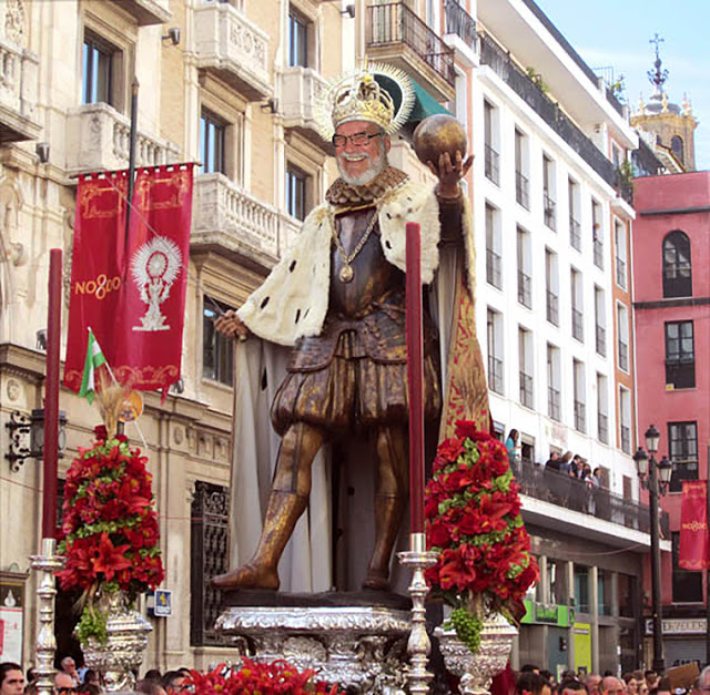 I christened the day “Día Cuadrienal de San Geraldo” (San Geraldo’s Quadrennial Day). Our brother-in-law Tom and I bought SG a crown that year that looked just like one of the ones his 22-greats grandfather, Ferdinand III, wore. The next leap year, 2016, SG thought I should have hired a crew of musclemen to carry him around. I let him down again in 2020.
