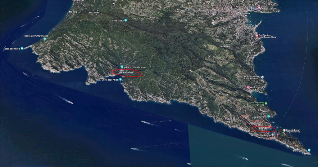 • San Frutuoso rodeado al centro, Portofino rodeado a la derecha.