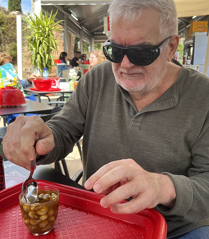 Por 1,80 €, fue un vaso generoso. SG se comió la mitad y los disfrutó. Usó un palillo para algunos que se resistían. Pero no pudo beber el líquido, aunque no le molestaba el sabor. Me alegro de haberlo intentado antes de que SG me enseñara uno con las antenas intactas. Me bastó. Además, ¿acaso un caracol no es solo una babosa con techo? ¿Acaso come caracoles?