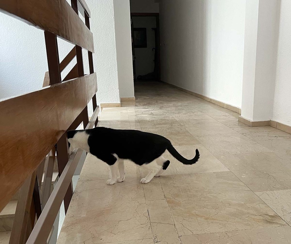 I sit on the stairs going up and monitor them. Yes, they would take the stairs. Moose did several years ago in Fuengirola and then in a panic ran to the closed door of our downstairs neighbors having no clue it wasn’t our door (didn’t even notice that our entry hall jungle was absent nor that the door was a completely different color and style… and vintage). Never again. Yeah, SG cleans and mostly feeds. I play!
