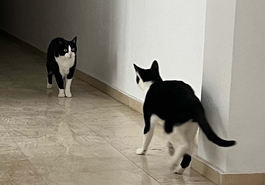 I try to keep the cats stimulated by playing with them often. They love to go out to the hall with me where they can explore new sights and smells. Dudo sometimes waits at the door for me to go out with him. Moose usually follows once we’re out.