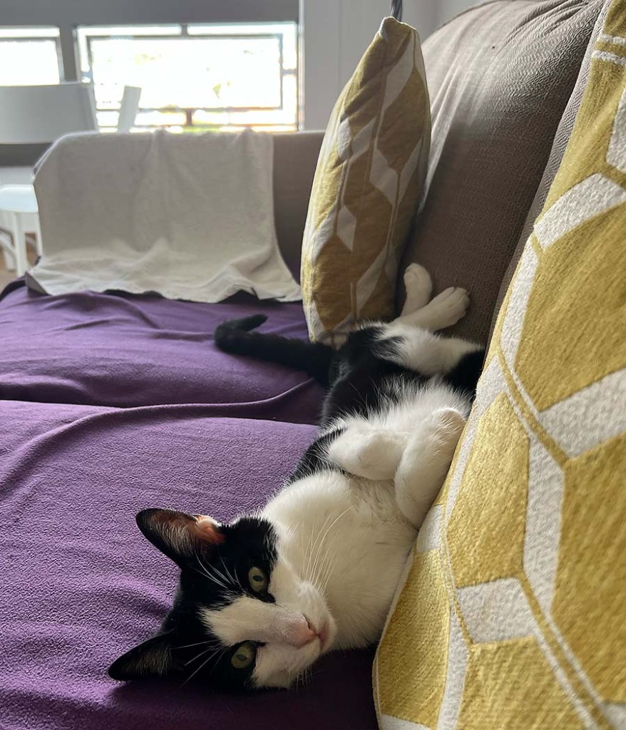 Moose, que al principio era más distante que Dudo, ahora es el gato más cariñoso y afectuoso. Maúlla cuando entramos en una habitación y se espera que lo dejemos todo y le abracemos. Le encanta que apoye la cabeza sobre él y frote mi cara contra la suya. A Dudo, de repente, le encanta que le recorra el lomo con los dedos, algo que siempre rechazaba. Cumplirán 14 años en menos de dos meses y siguen sorprendiéndonos. Yo también lo llevo muy bien. San Geraldo limpia la caja de arena, se levanta temprano para alimentarlos y limpia casi todo lo que ensucian. Tengo que evitar los gérmenes, ¿sabes? Es muy práctico.