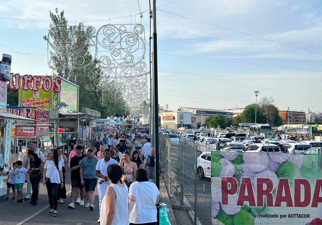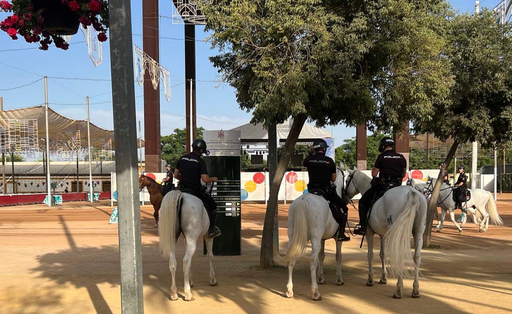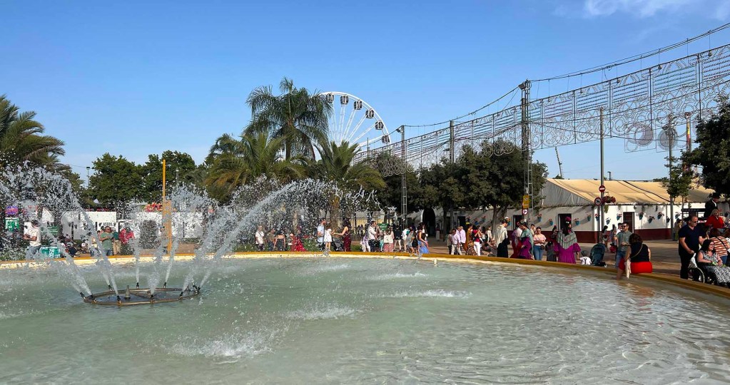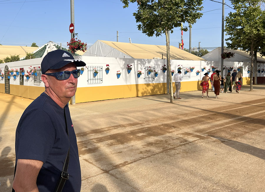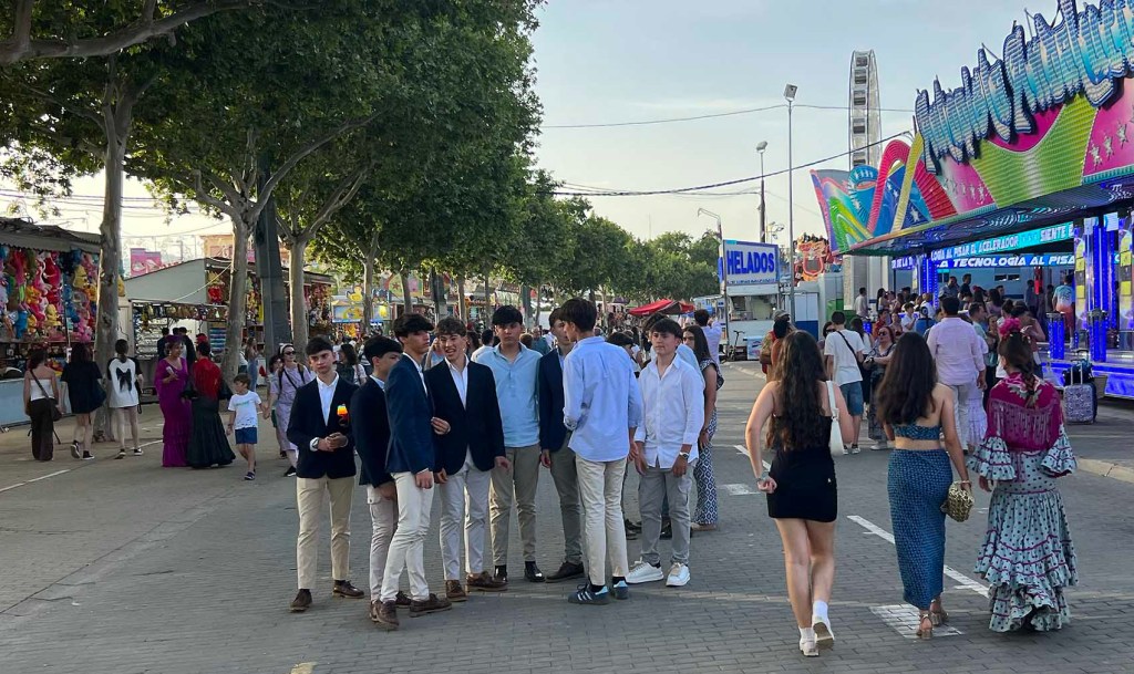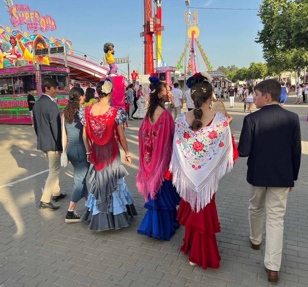 Tynan and Elena were here from Fuengirola Friday for two nights. We had dinner Friday and Saturday, breakfast Saturday and Sunday, and I got to take in the fair with them. I say “take in” because “enjoy” wouldn’t have been truthful. It was fun to see. Córdoba’s fair is beautiful, well-organized, enormous, painfully loud, and, this year, hot. We went during the day because, had we gone after dark, it would have been louder and so crowded we would barely have been able to make our way through it. So, although I’d love to see the spectacle of it lit up at night, I think I’ll just have to get those images from the news.