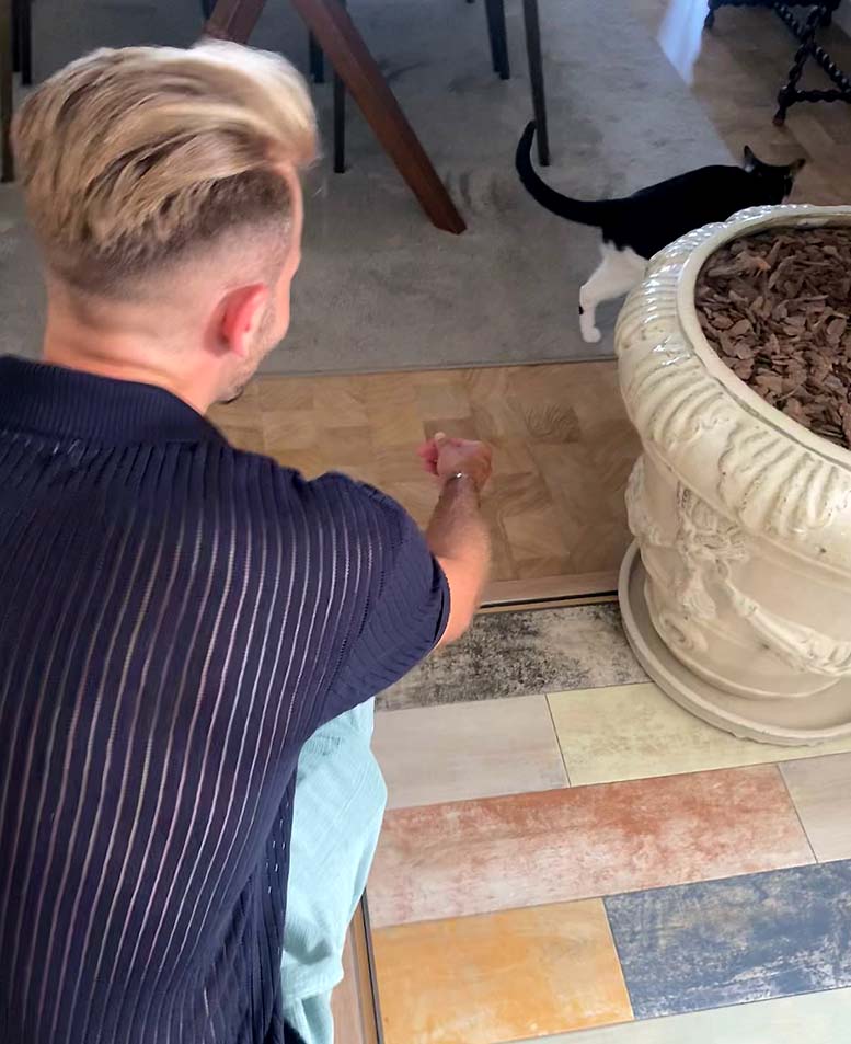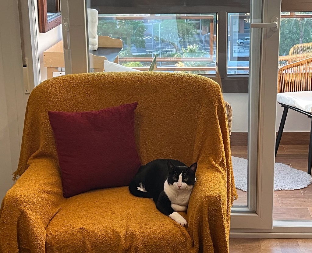 A Connor y Maureen les encantan los gatos, así que siempre se alegran de ver a Dudo y Moose. Ojalá pudiera decir lo mismo de Dudo y Moose. Esos pequeños estirados. Dudo vino a saludarnos el miércoles, pero dudó (Dudo dudó) al ver a “otros”. Aun así, se quedó a echar un vistazo. Cuando Connor se arrodilló para saludar, le bastó. Movió la cola y se fue. Pero entonces Connor les dio sus aperetivos. Moose, aunque devoró su aperetivo, seguía sin impresionarse. Dudo, sin embargo, pasó rápidamente por la sala, como diciendo “Pueden quedarse”. Si los dos están en el árbol para gatos de la oficina de San Geraldo cuando alguien los visita, al menos ahora se dejan acariciar.