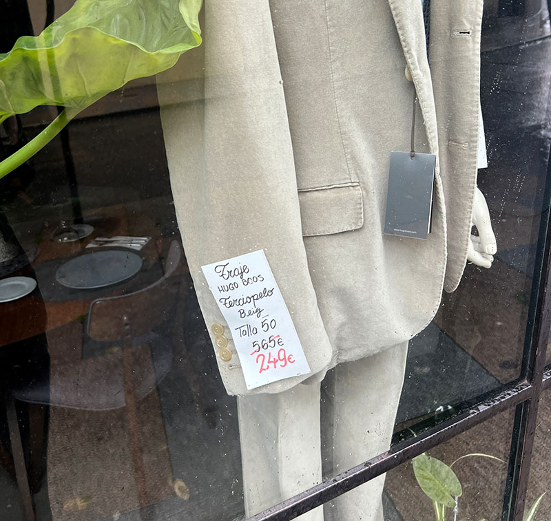 A shop near home has another Hugo Boss item on sale. It looks to me like a tuxedo, but is labeled “Traje ó Smoking.” “Traje” means “suit.” “Ó” mean “or.” “Smoking” I assumed meant “Smoking” but that certainly is not what I know as a smoking jacket which I always thought was a very cool thing to own when I was young. I looked it up. “Traje” does in fact mean suit, but “Smoking” means “Tuxedo.” Or maybe they mean you’ll be smoking hot when you wear it.