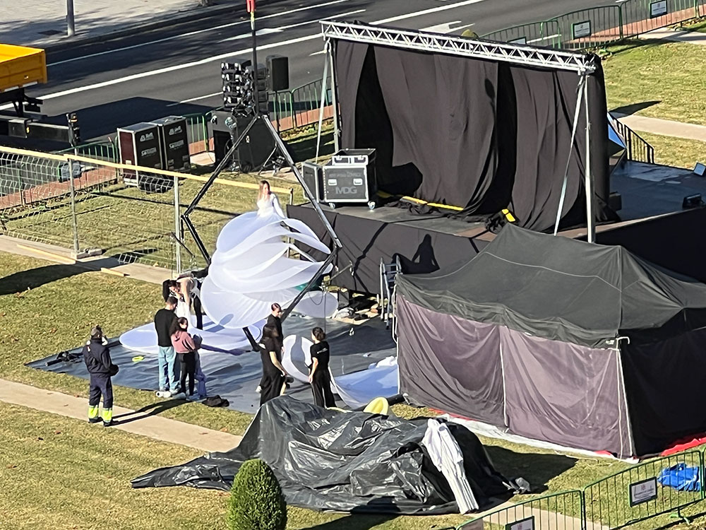 “The show combines dance, acrobatics, and light, and is divided into seven acts carefully woven together through a visual and musical narrative. It begins with the descent of a large diamond that opens to reveal a moon, where the suspended dance number begins. Following this, dancers, acrobats on five-meter-high structures, an angel lifted by a crane, plays of light and reflections, and an aerial wheel act prelude the final act, which brings all the artists together on stage for a grand finale that delivers a message of light, emotion, and shared celebration.”