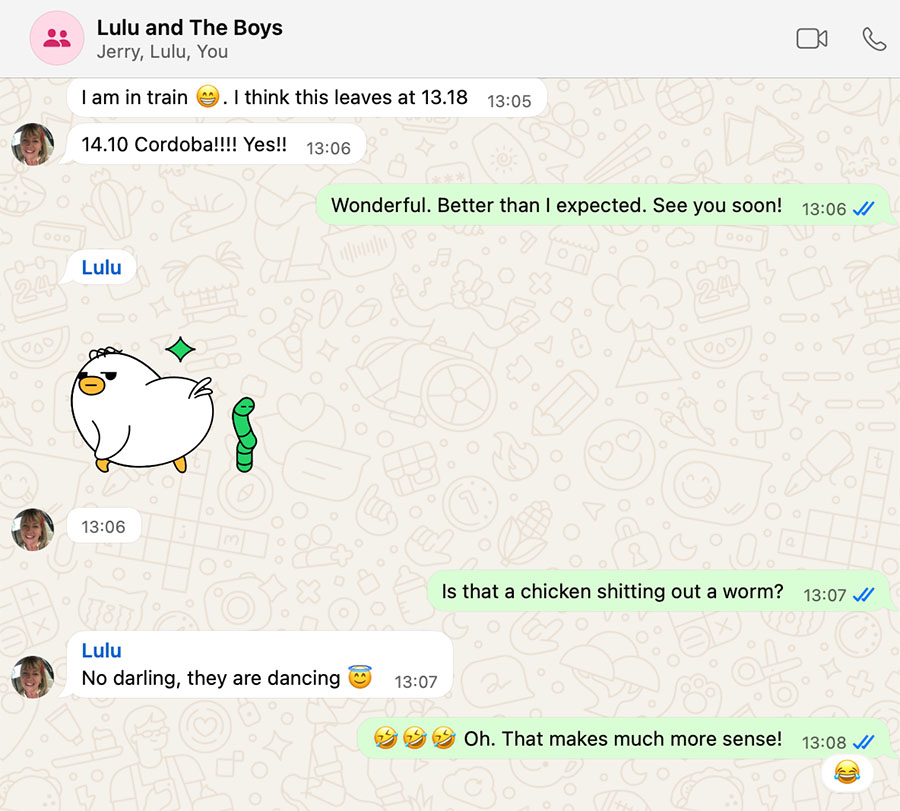 Today’s final image is a WhatsApp exchange I had with Lulu after she changed from bus to train in Antequera while on her way up. I don’t think I was too much of a smart ass.