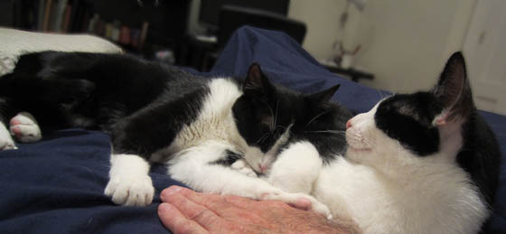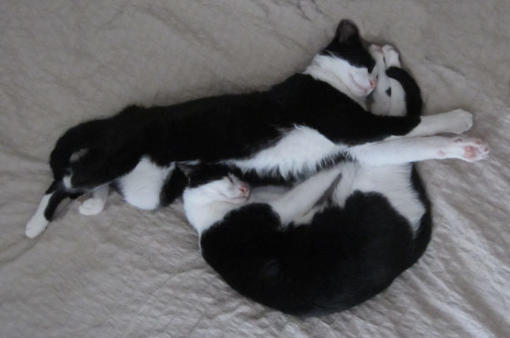 Today is the 14th birthday of Dudo and Moose. They are stand-offish, affectionate, stubborn, cooperative, good eaters, picky eaters, clean, messy, trusting, suspicious, gentle, snippy, intelligent, slow-witted, calm, neurotic, inconsistent creatures of habit. I suppose I just described cats in general.