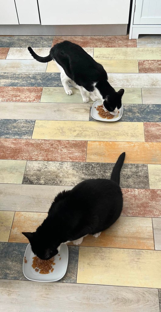 Hoy es el 14º cumpleaños de Dudo y Moose. Son distantes, cariñosos, testarudos, cooperativos, comen bien, comen mal, limpios, desordenados, confiados, desconfiados, gentiles, insistentes, inteligentes, torpes, tranquilos, neuróticos y criaturas de hábitos inconsistentes. Supongo que acabo de describir a los gatos en general.