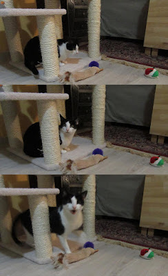 Have you wondered what the cats have been doing while I moped through a few days sick in bed? Nothing any different from what they usually do. Enjoying the sun on the terrace (both). Dragging toys wherever I dragged myself (Dudo) and then expecting me to play fetch. Meowing incessantly until someone/anyone provided undivided attention (Moose). Begging to be cuddled but only cooperating if I got down on the floor (Moose). Demanding company while he ate (Moose). Both completely unaware that things needed to be a little different for a few days. Both completely happy that it’s all back to near-normal. I heard Dudo mutter to Moose yesterday, “It’s so hard to find good staff these days!”