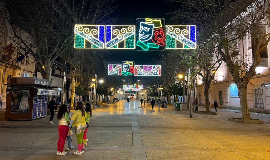 Hay una cabalgata el próximo fin de semana y todo tipo de competiciones durante el Carnaval. Los dos grupos musicales más comunes son las comparsas y las chirigotas. Una comparsa suele estar formada por entre 12 y 16 artistas, y los cantantes y músicos suelen ser de mayor calibre que los de una chirigota. Las chirigotas suelen tener entre 7 y 12 artistas y son más humorísticas y satíricas, y con más energía. Espero ver una chirigota antes de que acaben las festividades. Las chirigotas suelen actuar de forma aleatoria en las calles, además de en el escenario. Estoy bastante seguro de que el grupo que vi anoche (ver abajo) era una comparsa.