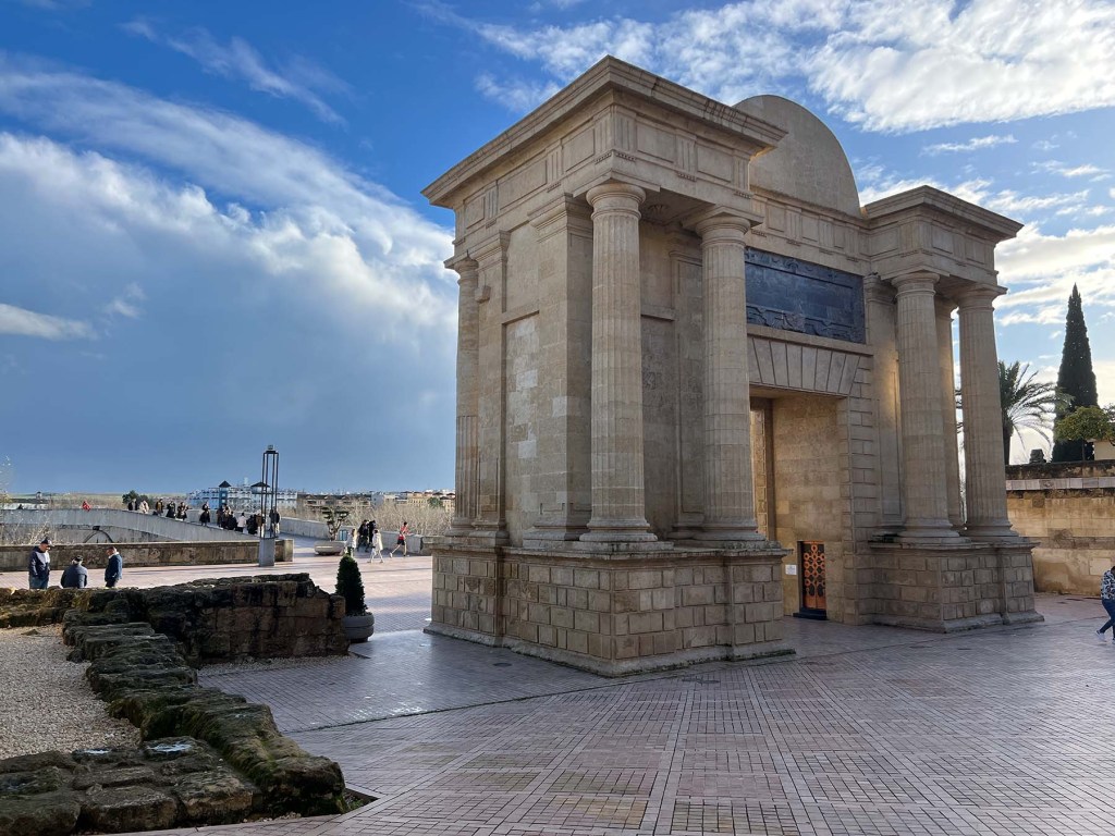 I headed out yesterday afternoon under cloudy skies, but blue sky began to appear during my 25-minute walk to the river and I even saw the sun. I crossed the river (another 8 minutes) and entered Calahorra Tower (my first time). It’s a fortified gate built in 1333 by the Almohad caliphate to protect the Roman bridge. Unfortunately, it was closing in 15 minutes, so I had to make quick work of it, including climbing to the top. It was fascinating, the view was impressive, and as a resident, it only cost me €2. I look forward to going back and having time to peruse the exhibits and get better photos.