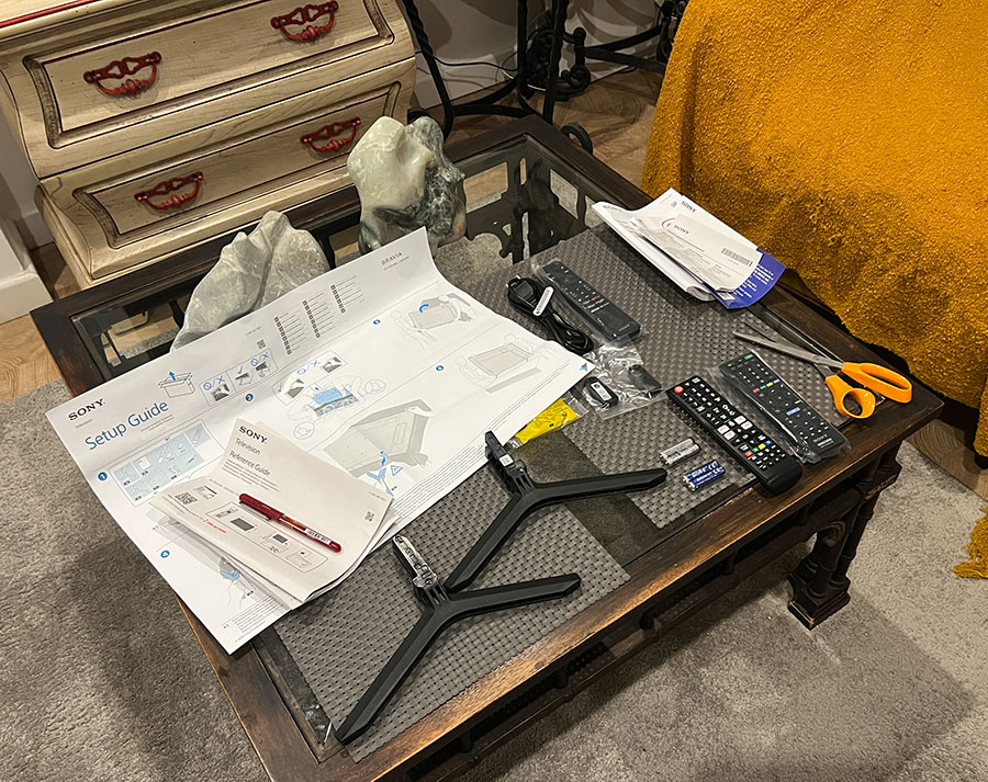 I arrived home to find the unboxed new television in the foyer, still wrapped. The instruction manuals, remotes, and parts for the stand were spread out on the cocktail table in the living room.
