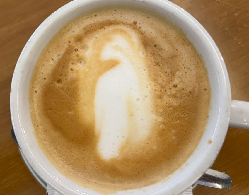 • Our morning barista, Joel, would like to learn foam art. Do you see a horse? Is it a whale? He said it was an accident.