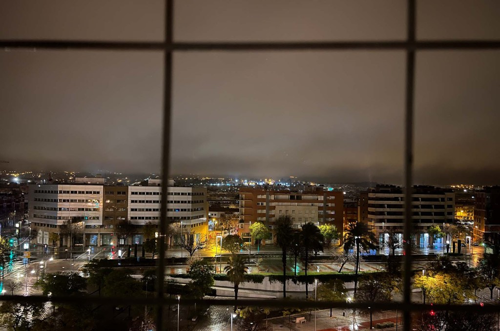 El cielo tiene varios tonos de gris pálido; la diferencia de grises apenas es perceptible. Sopla el viento. Las calles están mojadas, aunque no llueve en este momento. Se avecina más lluvia. La temperatura se mantiene alrededor de los 15 °C/59 °F. Durante los próximos 14 días, 2 días ofrecen la posibilidad de un breve atisbo de sol en algún momento. Fuengirola está un poco más cálida y se pronostican más atisbos de sol breves. El río Fuengirola se desbordó y se cayeron árboles en nuestro antiguo barrio.