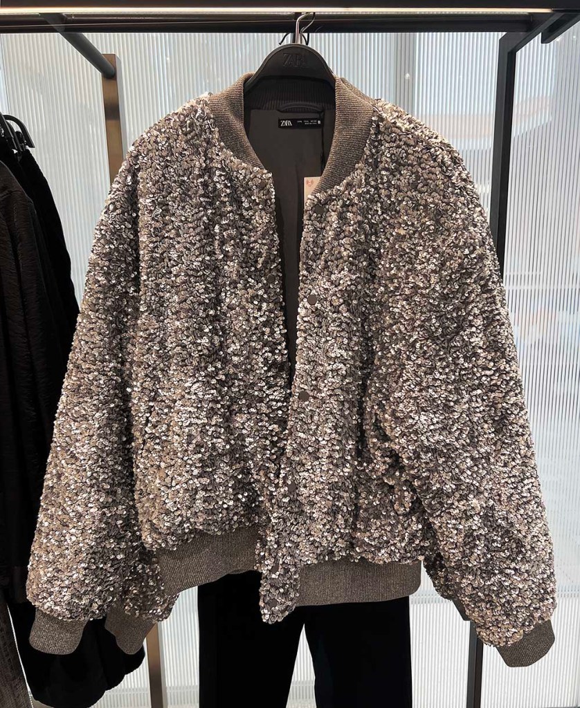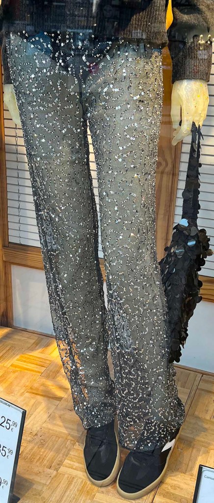 • And the perfect see-thru sequined pants (trousers) to go with the jacket. For under €40! Dare I go commando? Maybe a sequined thong.
