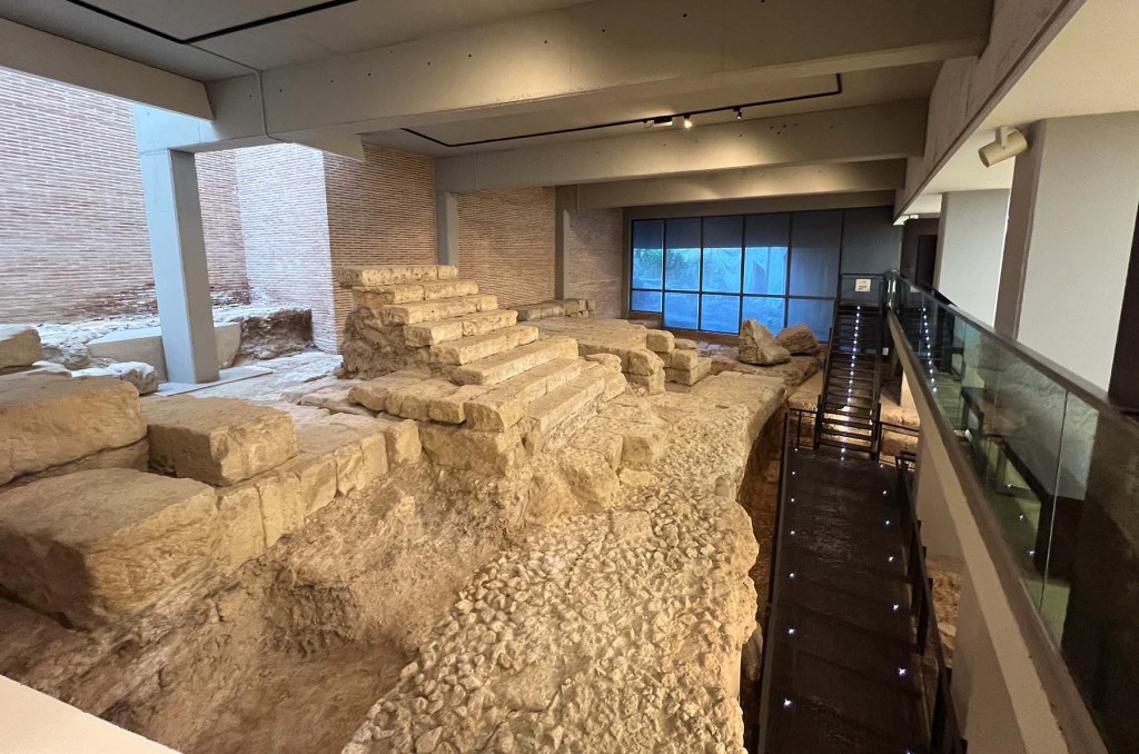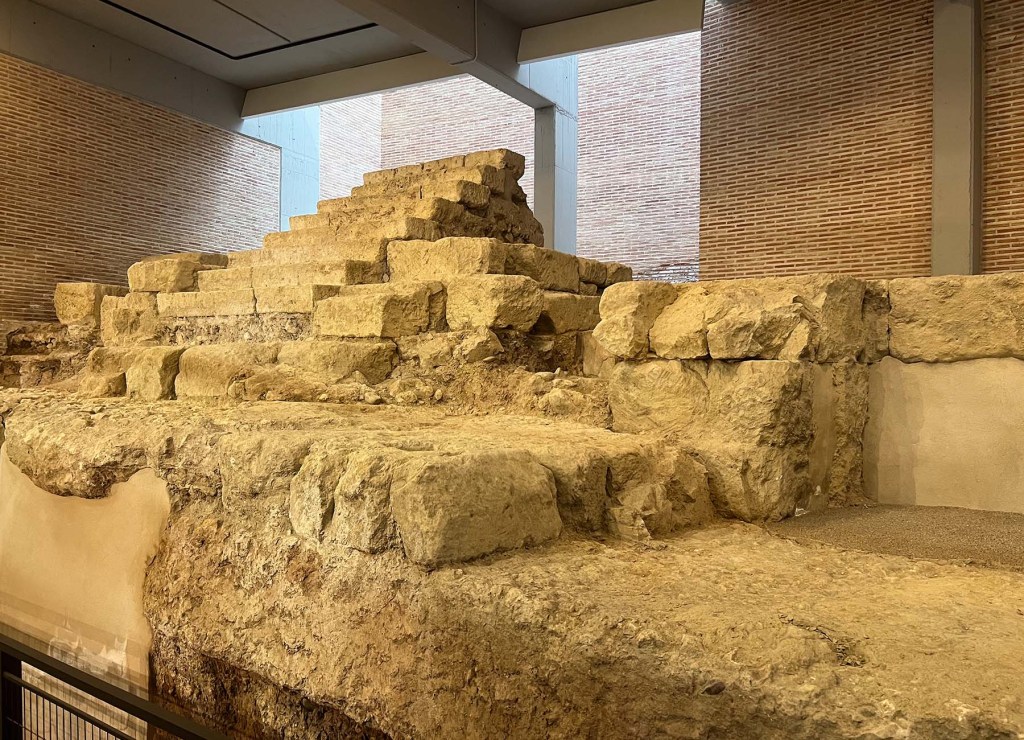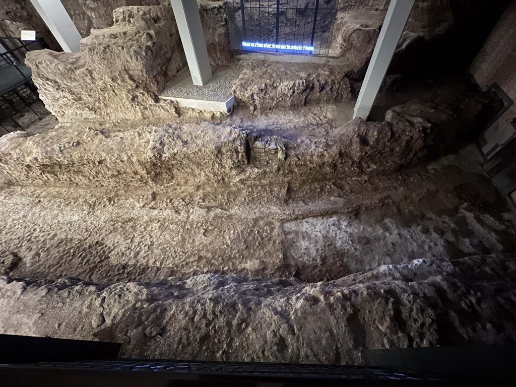 The relics displayed in the museum were found all over the city. I found it exciting when the name of a street, or even a specific address, was provided. The first photo below of a Corinthian capital from before the year 50 AD was found about a half kilometer (3/10 of a mile) north of where we live. The rest of today’s photos are views of the Roman amphitheater in the underground levels of the new museum.