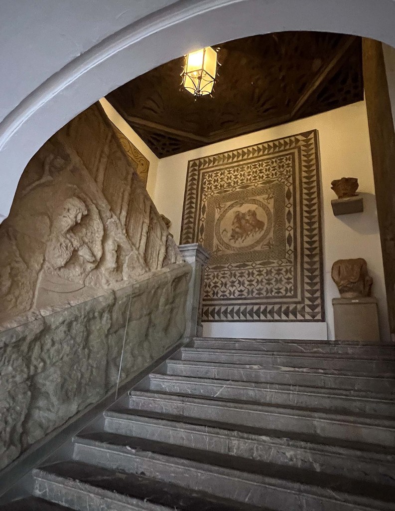 I’ve shared a bit before of the Paéz de Castillejo Palace, former home to the archaeology museum and now still part of the complex but next door to the contemporary building which contains the majority of the collection and sits atop the Roman amphitheatre. The current palace was built in the 16th century, the main courtyard created in 1538. The stunning and time-worn portal was begun in 1540. Portions of the interior were incorporated from surrounding houses, such as the 15th-century staircase you’ll see below.