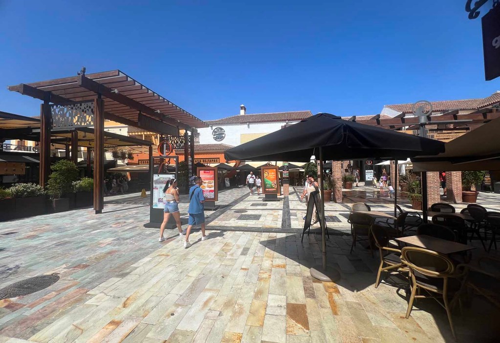 I rode the train Monday to Plaza Mayor and the McArthurGlen Outlet Mall. A four-hour outing. Such excitement. The train there (a 27-minute ride) had available seats the entire time. The train back was crowded, although not awful, and I got a seat halfway home. The shopping centre itself was fairly quiet thanks to the heat.