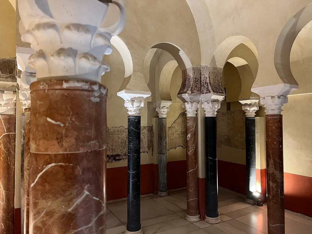 While out wandering last week (2-1/2 hours of walking) around the walls of the old city not far from the Alcázar (the royal palace), I came upon The Caliphal Baths, an Arab bathhouse complex I didn’t know anything about. The baths date back to the 10th century but were updated and in use until the 14th century when new baths were built nearby within the walls of the Alcázar, which had been the palace of the Umayyad Caliphate followed by the Almoravids and then the Almohads before being taken by the Christian conquerers.