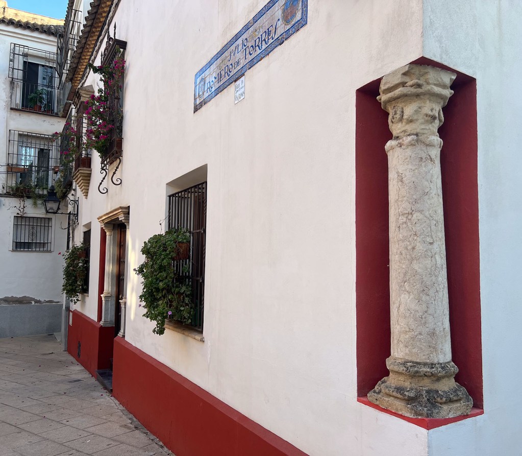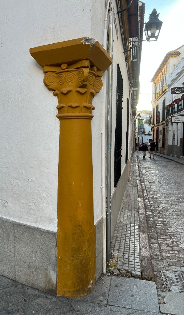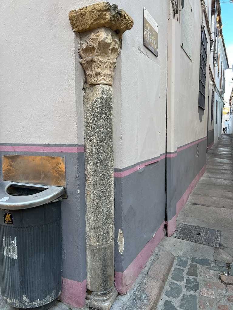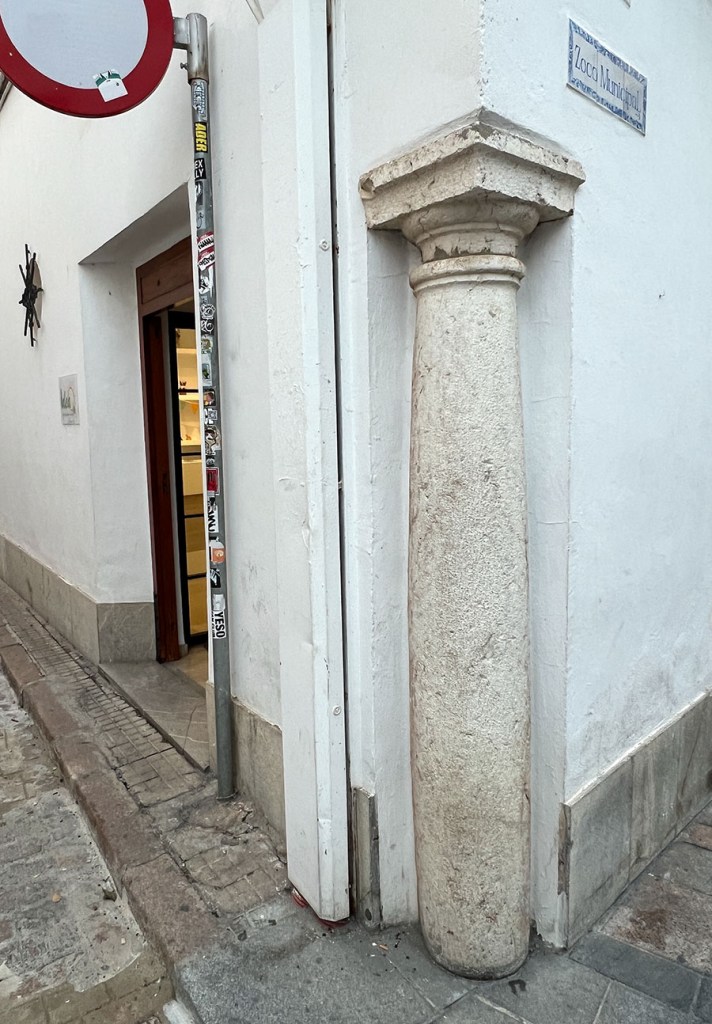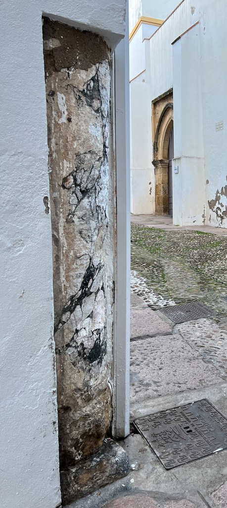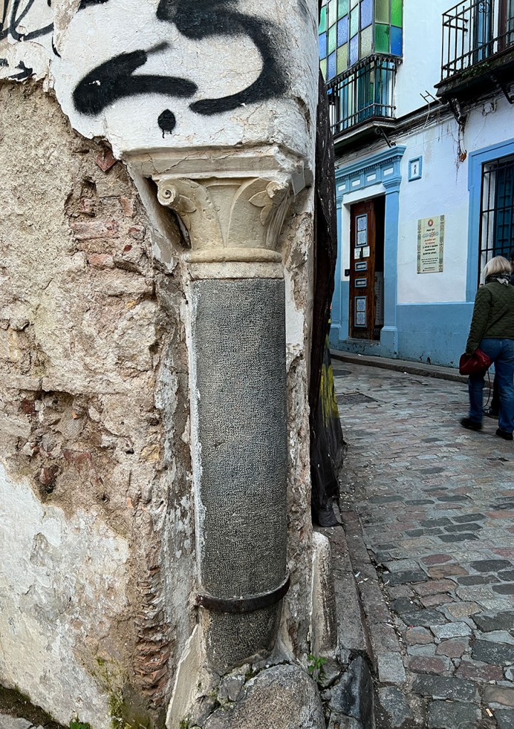 In Seville, I also often came across buildings with millstones built into the exterior walls. I learned then that the usually granite millstones were specifically intended to protect the plaster and brick walls from old carts and their large wheels. Our current street was once populated with mills. There’s a mill stone monument, of sorts, across the street, but I haven’t yet come across any mill stones in walls in Córdoba.