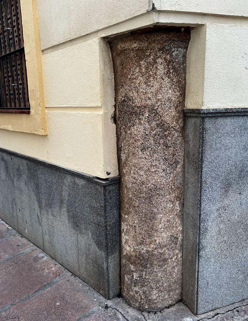 En Sevilla, también me encontré a menudo con edificios con piedras de molino empotradas en los muros exteriores. Entonces supe que las piedras de molino, generalmente de granito, estaban destinadas específicamente a proteger las paredes de yeso y ladrillo de los carros viejos y sus grandes ruedas. Nuestra calle actual estuvo poblada de molinos. Hay una especie de monumento con una piedra de molino al otro lado de la calle, pero todavía no he encontrado piedras de molino en los muros de Córdoba.