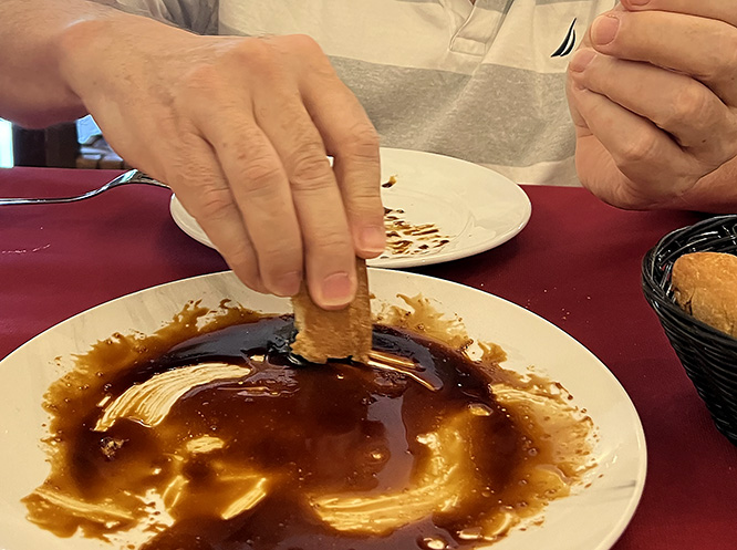 • Un almuerzo reciente en La Popina incluyó berenjenas fritas con miel de caña. Martín, el dueño, prepara las mejores que hemos probado. La segunda parte favorita de SG es usar pan para absorber la miel restante. Y Martín es aún más generoso con la miel por esa razón.