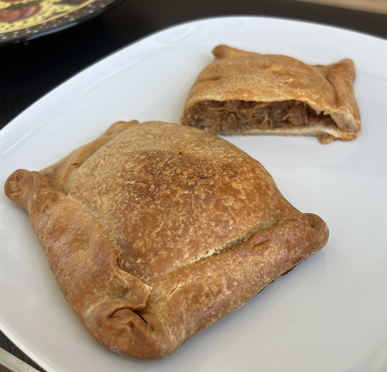 San Geraldo trajo a casa unas deliciosas empanadas rellenas de carne para el almuerzo de ayer. Él sabe que me encantan las empanadas. Una comida completa en un solo recipiente es perfecta para mí. Vio unos tomates preciosos mientras compraba y compró un par. Fueron un acompañamiento excelente. Un almuerzo increíblemente bueno y barato.