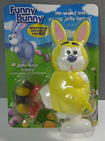 I ALSO BROUGHT BACK A couple of special items for my 3-year-old pal Luke — a plastic wind-up Easter bunny that walks and poops jelly beans, and a container of Fluffy Marshmallow Chick Slime, which contains three little chicks. The container says it’s scented. I don’t know if it smells like marshmallows or chickens.