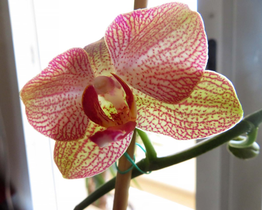 • Steve of Shadows and Light shared a photo of one of his orchids resplendent with flowers. Here’s one of ours. One blossom and four buds.