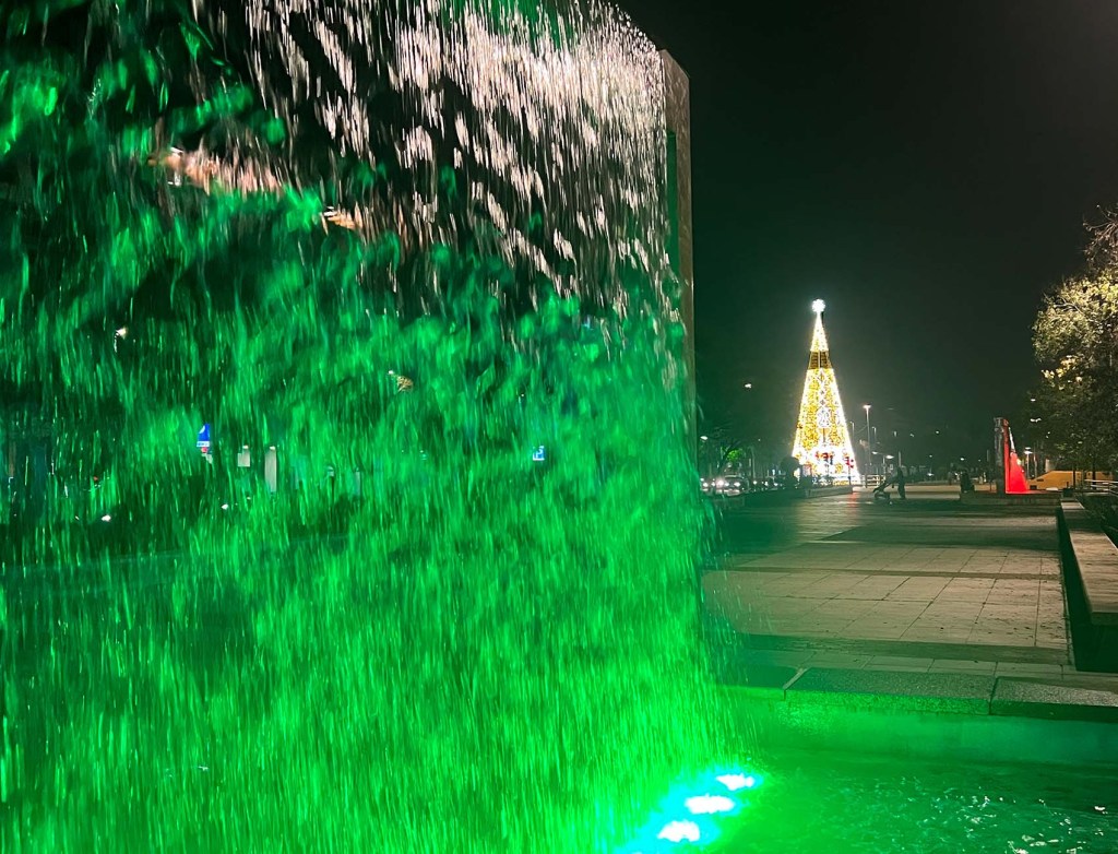 Today’s photos are among the line of seven matching fountains in our neighborhood that grace the Paseo of Córdoba. In Christmas colors now, they add magic and drown out the traffic noise. The line of fountains begin right after the winter wonderland butterfly park ends. It was a nice walk home.