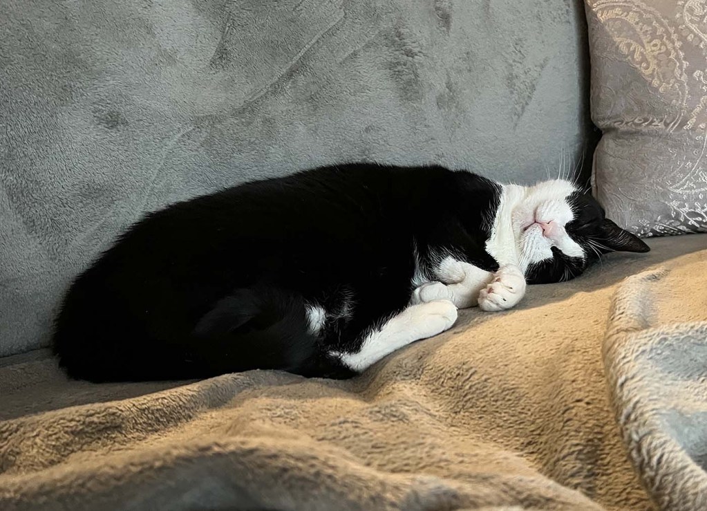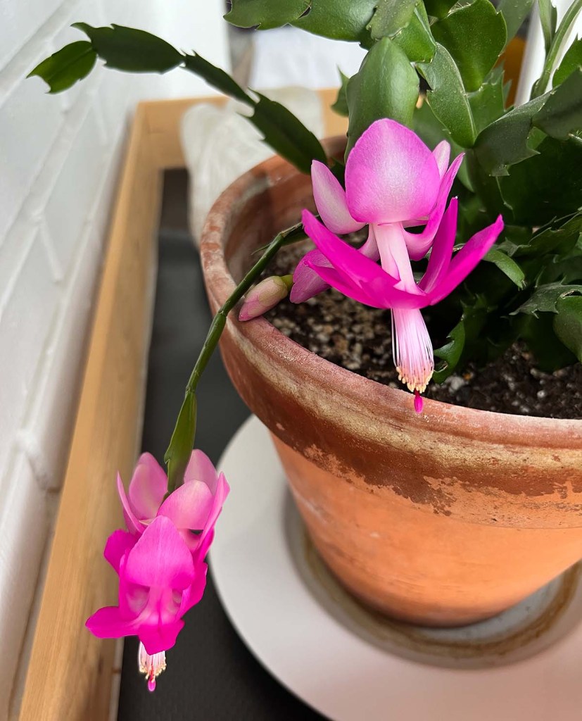 The Christmas cactus continues to bloom, happily. We don’t turn it, we don’t move it, we just admire it. The cats continue to be cats. Dudo is ever skinnier, but content and still curious. Moose is a lover with us and a lover and a fighter with his brother.