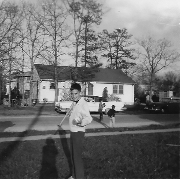 • Yo en la foto de la izquierda siendo obligado por mi madre a sostener el bate de béisbol para que mi padre pudiera demostrar que su hijo de 1 año era un hombre de verdad. Mi primo (mi matón perpetuo) ya había agarrado la pelota. (Esa es Dale al fondo.) Foto de la derecha, 9 años después mi padre todavía lo intentaba. Nota: De hecho, podría batear una pelota de béisbol — a veces. (Haz clic en las imágenes).