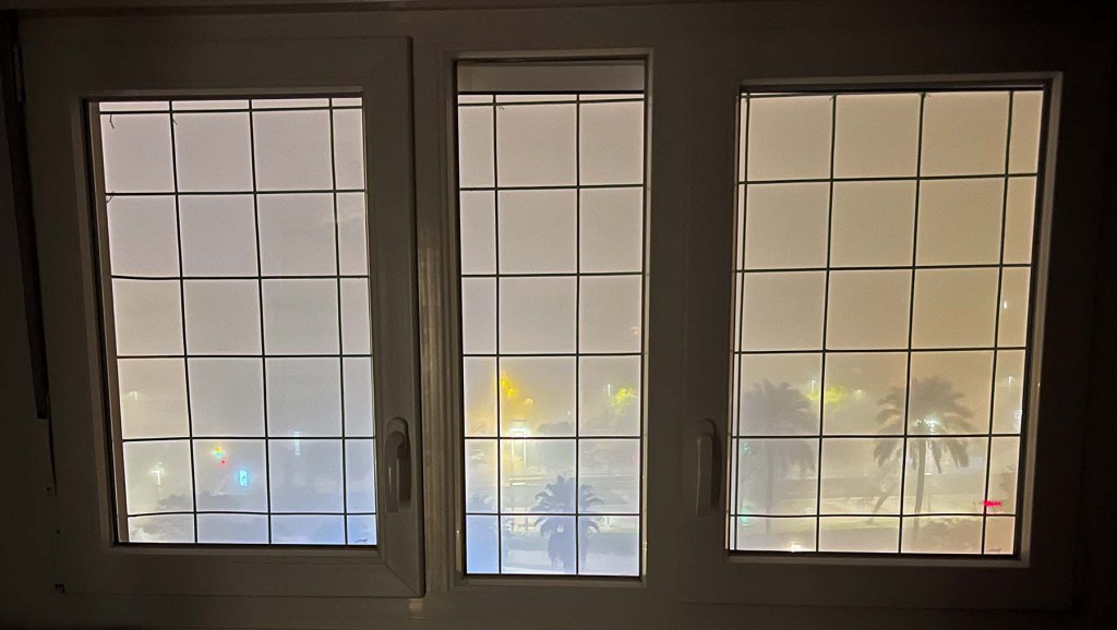 Hoy quería sentarse en el sofá y acurrucarse conmigo. Así que paré de empacar durante 10 minutos, y ahora estoy demasiado mareada para retomarlo. En las fotos de hoy, desde la ventana del dormitorio, se puede ver cómo ha estado el aire y por qué no he estado en mi mejor momento. Creo que es hora de echar una siesta con SG.