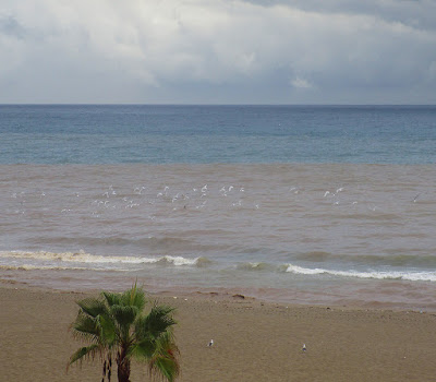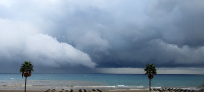 Meanwhile, here are some photos of the terrace view of Monday morning’s magnificent, brilliant, dramatic, foreboding, evil, and threatening Mediterranean Sea and sky.