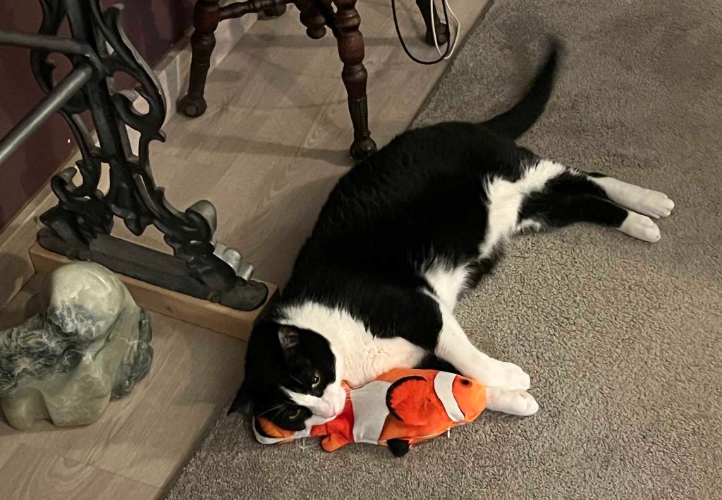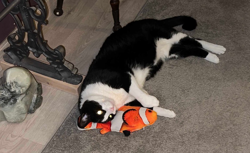 • Unfortunately, I had turned on the flash. The flapping fish tail is activated by touching the fish precisely where Moose’s head rests. I wonder if he just liked the feel.