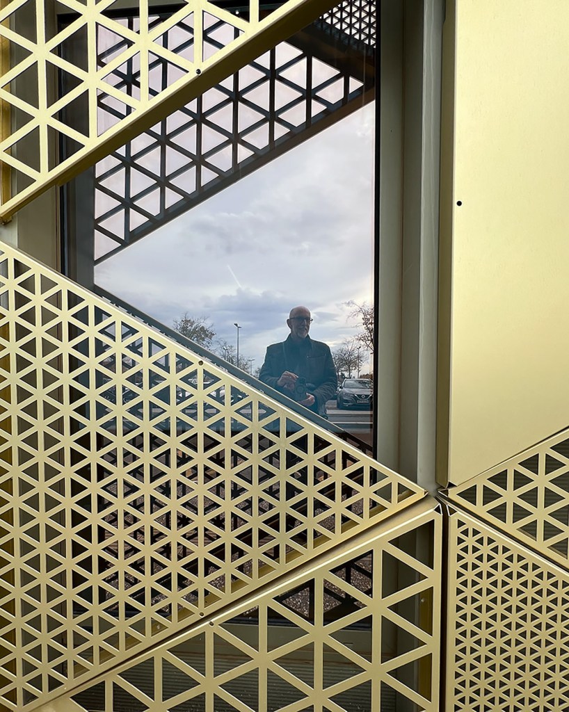 I was back yesterday at Quironsalud, our private health center to see a dermatologist. Great, helpful, useful appointment. When I was leaving the center after Tuesday’s happy nephrology appointment, I looked out the hall window and stopped for a photo. It’s a cool building. That photo is the first one below. So, I stopped at a different set of windows this time and took in some more views. Then, while waiting outside for my taxi, I took a selfie. I could probably spend an hour experimenting with the views, but I only had a moment.