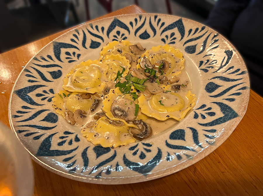 On our way home, we walked to an Italian restaurant Shannon recommended. The 10-minute walk took a half hour; hordes of people were coming down the street for the second show while hordes were walking up the street from the first show. On top of that, cars were trying to get through which meant we all had to squeeze against the buildings at times. We were often at a dead stop. It was unpleasant, to say the least, but we made it and, because it wasn’t even 8 p.m., we had our choice of tables. The meal and company were excellent.