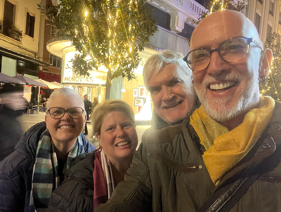 Sabíamos que el espectáculo de luces con drones iba a ser sobre el Puente Romano. Supusimos que sería en lo alto, así que nos mantuvimos alejados de la multitud y decidimos verlo desde la pared trasera de la mezquita, junto con muchos otros. San Geraldo encontró un banco (como muchos otros) debajo de la puerta del puente, porque le dije que el espectáculo sería en lo alto. Bueno, no fue así y apenas se veía desde el banco. SG luego encontró un lugar a la izquierda de la puerta, que era mucho mejor. Shannon y Stacy lo disfrutaron con la espalda contra la pared, perdiendo solo los drones más bajos. Encontré un lugar un poco más alto en las escaleras que conducen al parque donde se encuentra el monumento de San Rafael. El año que viene necesitamos estar en una mejor posición. Quizás en el puente, donde el espectáculo de los 150 drones estaba claramente dirigido.