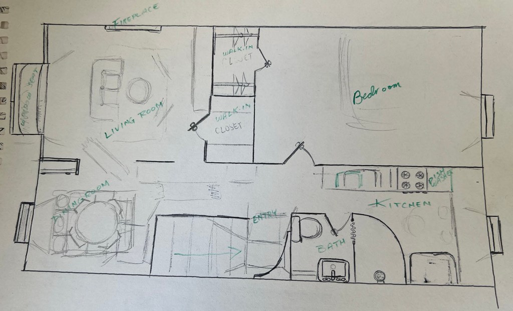 While rifling through my portfolios and sketchbooks, I found many things I created in Boston, when I was never without a sketchbook. The first is the floor plan of my apartment on Worcester Square, a very cool, top floor of a large 5-story brownstone. My friends owned the house, lived on one floor while the rest was intended for renovation. All they got done was my rental on the top floor and a basement apartment rental.