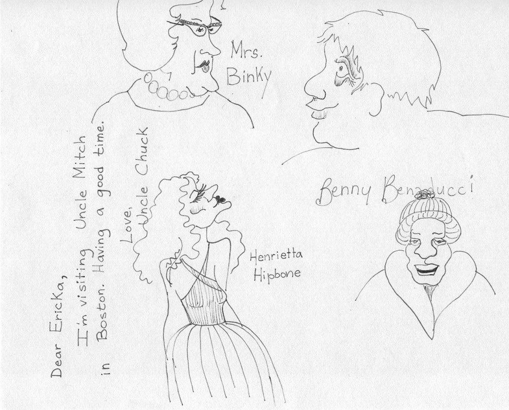 While he was visiting he picked out a postcard to send to our niece, Dale’s 7-year-old daughter, in England. As always, he would decide what to say, I would print it for him, and he would copy it onto the postcard. On that same page, I entertained him with cartoon figures and we (mostly I) named them. I can still hear that laugh. Hey, he was easily impressed and we had a good time. The photo at top is the two of us in Rockport, Massachusetts during that visit.