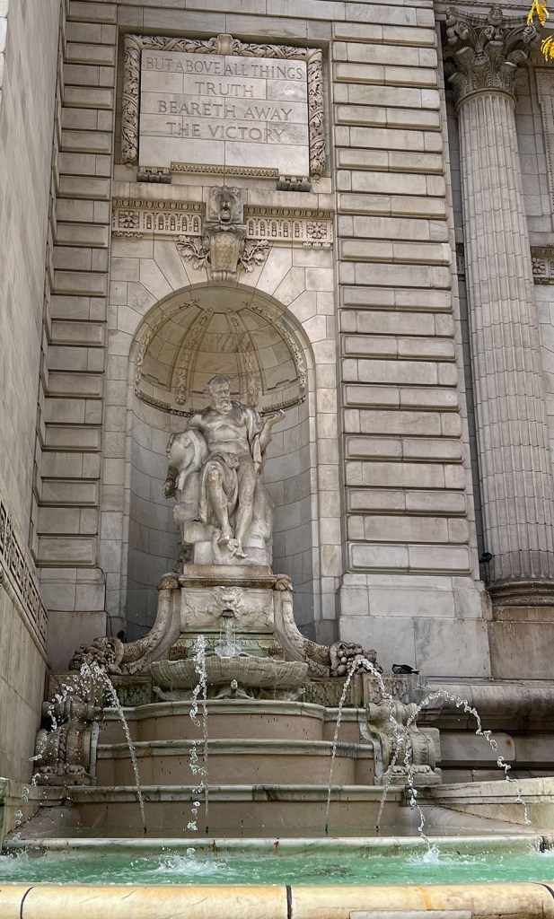 News to me, the library was built on the site of the former Croton Distributing Reservoir, New York City’s primary water source when it was established in 1842. Before that time, water was obtained via cisterns, wells, and rain barrels. The water came from the Croton River in Westchester County about 40 miles north. If you go downstairs in the library you can see some of the granite foundations of the old reservoir. The things I learn now that I no longer live there!