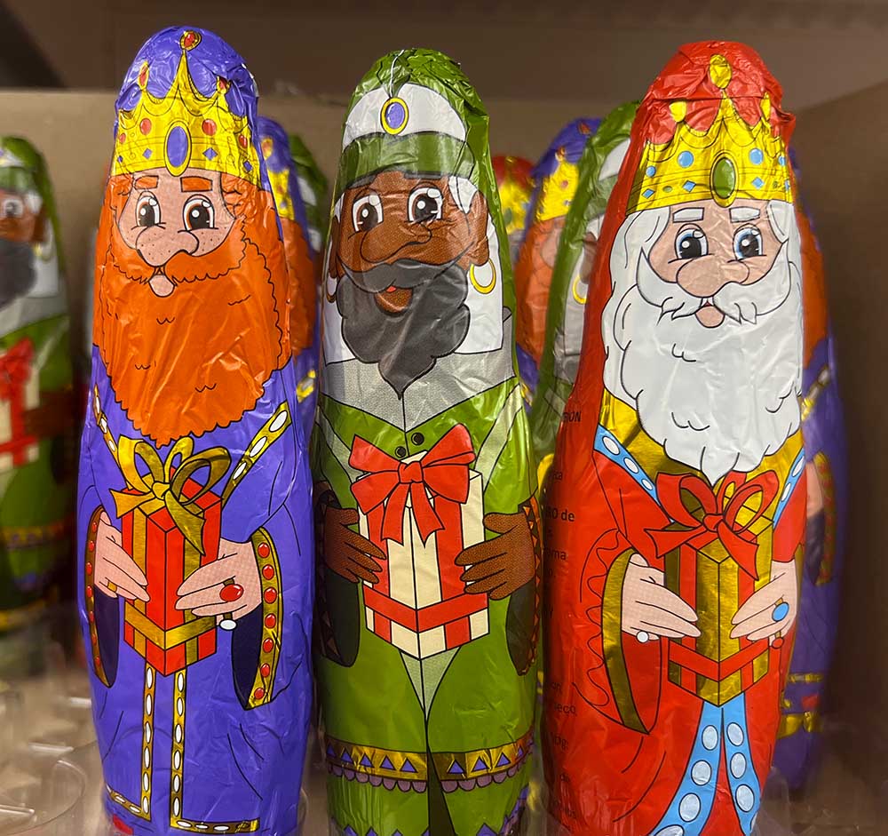 • En un encantador supermercado de barrio, los Reyes Magos de chocolate. No hay Papá Noel. Tradicionalmente, Papá Noel no existe en España, aunque hoy en día se le puede encontrar en casi todas partes. Los Reyes Magos traen regalos el 6 de enero.