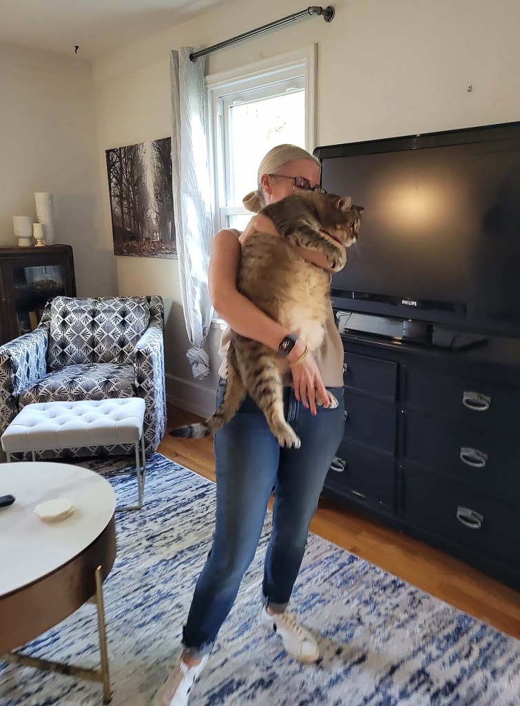 Lindy y Matt (nuestra increíble sobrina y sobrino) tienen varios gatos. En el pasado tenían muchos más, llegando a un máximo de 13 hace varios años. Compartí fotos e historias cuando estábamos en Dakota del Sur en 2016, incluida una foto de Lindy sosteniendo a Joey, a quien le encanta que lo carguen boca abajo. (Haz clic aquí.) Joey es un amante absoluto y no puede recibir suficientes mimos y atención. La foto de hoy es de Nicole, la amiga de Matt y Lindy, sosteniendo a Joey. Joey es un niño muy grande.