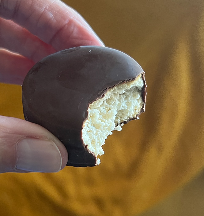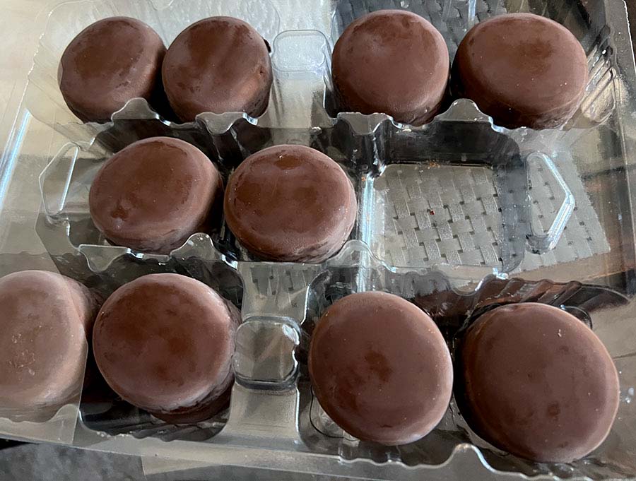San Geraldo bought a treat for us at the supermarket (he really needs to stop doing so; I met with a nutritionist and should be cleaning up my act). He brought home a box of Nevaditos. They’re a Spanish sort-of shortbread, although softer and flakier than shortbread. A traditional Christmas sweet, nevadito means “little snow-covered one.” Traditionally, they’re heavily dusted with powdered sugar (icing sugar) to make them look snow-covered. Ours are bathed in chocolate, so not at all traditional. I like them. San Geraldo had an unsettled stomach after he ate three after dinner. He thinks he had an allergic reaction. I think he had too much to eat. I didn’t argue. The rest of the box was mine.