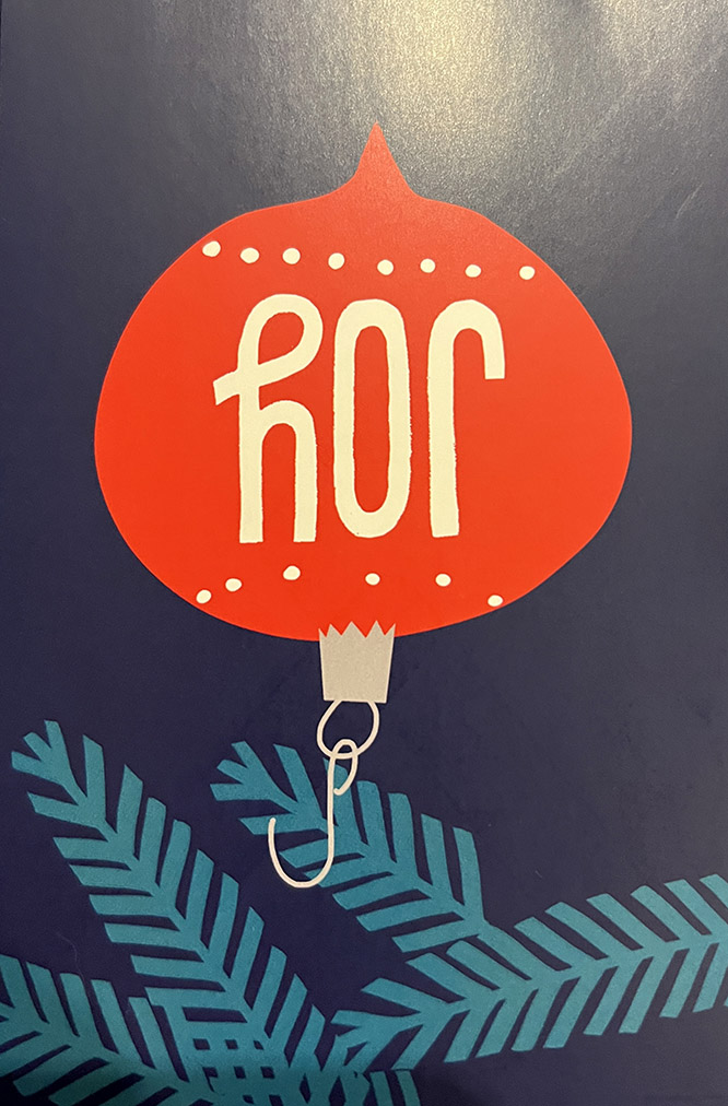 Tengo una prima que me envía tarjetas para cada ocasión especial. Tampoco se olvida nunca de El Hermanito. Cuando San Geraldo abrió la tarjeta más reciente, la sacó del sobre al revés y pensó que era una tarjeta de Janucá de la familia mitad judía. Pensó: “Esa es una palabra hebrea que nunca había visto antes (solo reconoce las palabras de la festividad). Me pregunto qué significa”. Luego dio vuelta la tarjeta.