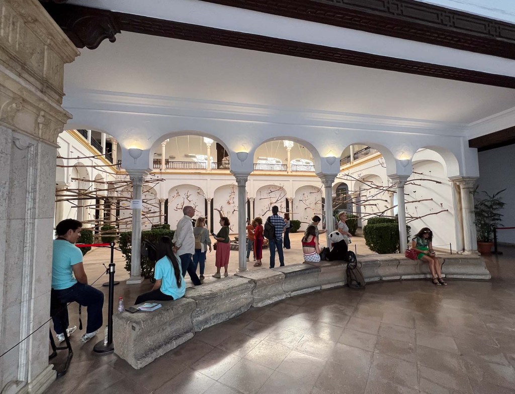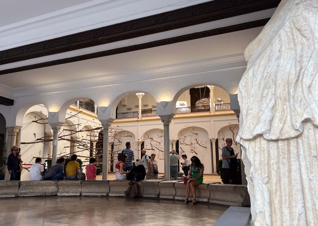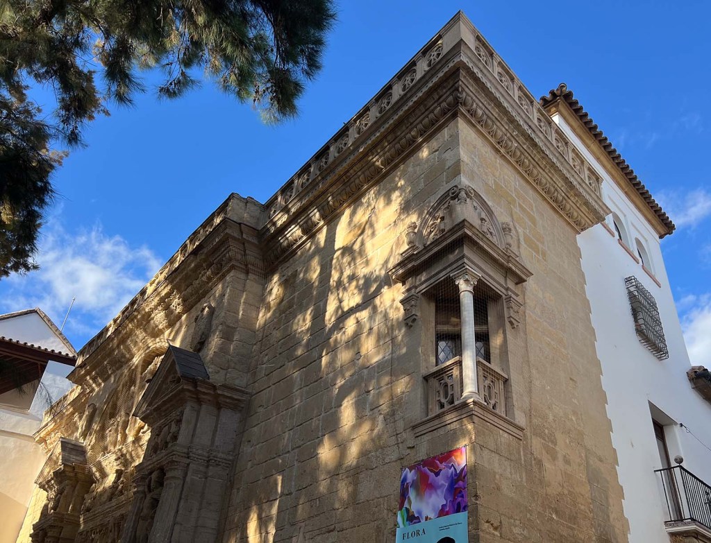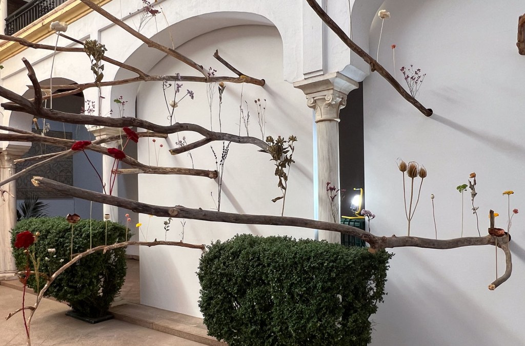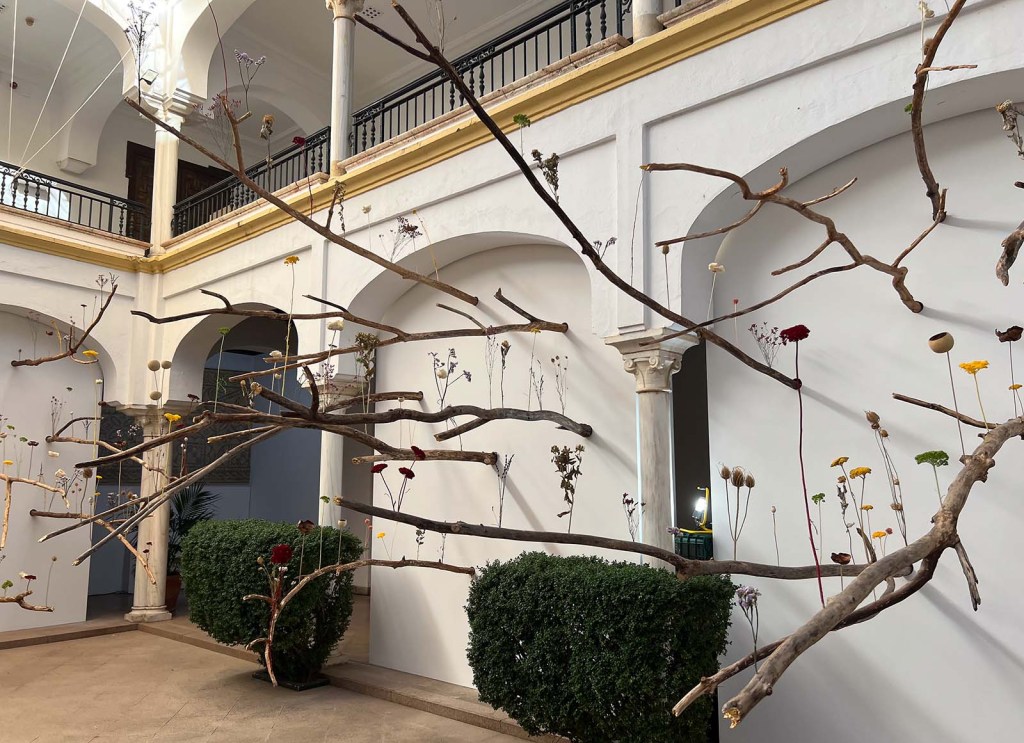 Mi idea era caminar de vuelta al barrio que rodea el museo de arqueología y tomar más fotos del exterior. El día se convirtió en algo aún más especial cuando descubrí una de las cinco exposiciones de Flora, esta vez en el Palacio de los Páez de Castillejo, del siglo XVI, junto al museo (y donde este se alzaba originalmente). Flora es el Festival Internacional de las Flores con actividades por toda la ciudad este mes, incluyendo instalaciones de creadores de España, México, Brasil, y Estados Unidos. Había visto carteles por la ciudad, pero no me había tomado el tiempo de averiguar qué era. Así que, cuando llegué a la plaza y vi un cartel en el palacio, pensé que era hora de aprender algo.