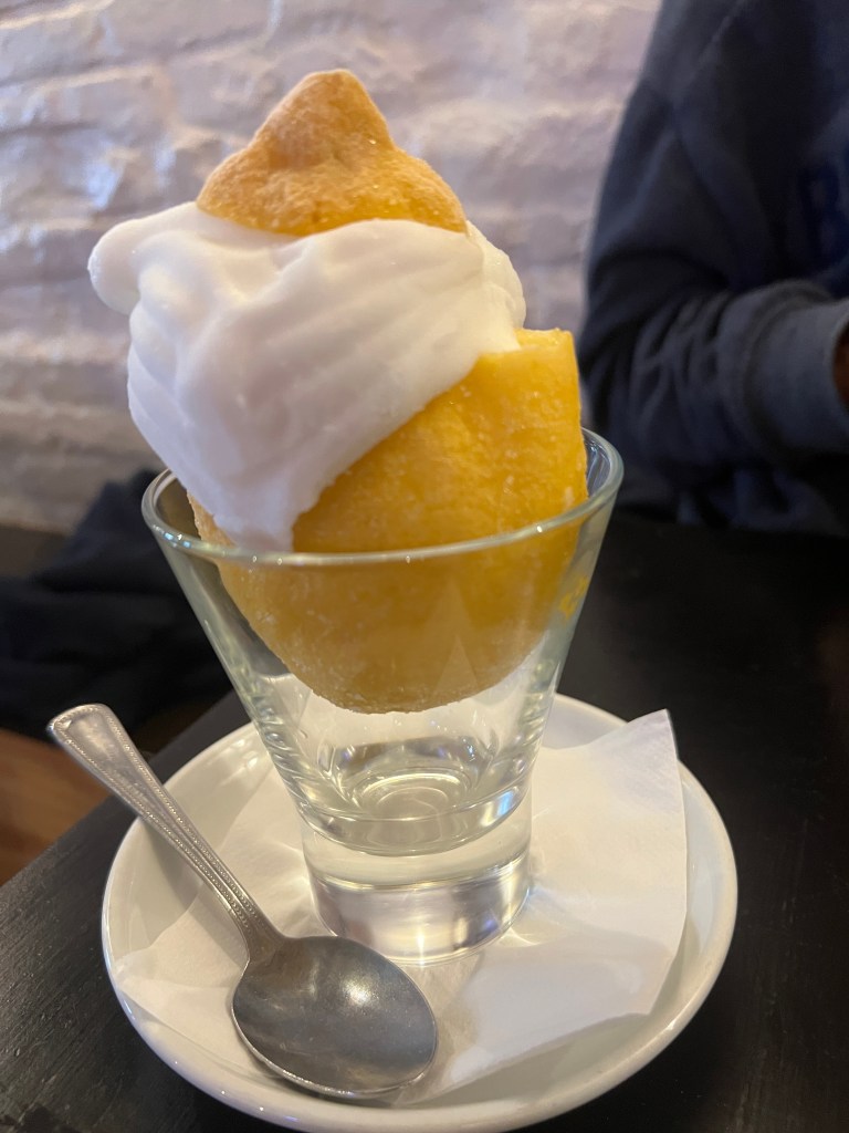 Las fotos de hoy son de El Hermanito y nuestros postres. La foto de arriba es de mi “canookie” en la pastelería Mia’s Bakery: dos galletas de pepitas de chocolate rellenas de crema de cannoli. Las galletas eran más bien como bizcocho y no me gustaron tanto. Mi hermano pidió su tarta de zanahoria de siempre, pero me dijo que estaba seca. Cuando volvimos el domingo, las galletas “canookie” seguían pareciendo bizcocho, así que yo me pedí una deliciosa galleta de jengibre y melaza y mi hermano una tarta de coco. Los dos quedamos encantados.